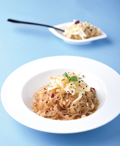곤약국수 200g, 사과 60g, 레몬즙 15g 볶음양념 : 맛간장 30g, 다진생강 3g, 다진양파 15g, 버터 10g 소스 : 다진양파 10g, 흑임자 7g, 플레인요거트 30g, 그라놀라 30g, 꿀 10g
