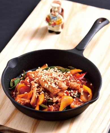 오징어 300g, 미니파프리카 40g, 양파 50g, 청고추 15g, 홍고추 15g 양념장 : 다진마늘 15g, 고춧가루 15g, 홀토마토 50g, 고추장 15g, 설탕 15g 올리고당 15g, 후추 1g, 참기름 15g 고명 : 볶은 현미 15g