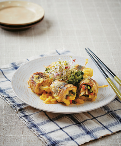 재료 꽁치살(200g), 마늘종(30g), 양파(40g), 파프리카(100g) 밀가루(30g), 깻잎(3g), 무순(8g), 새싹(8g) 오렌지소스 오렌지(200g), 레몬즙(15g), 설탕(0.3g), 고운 소금(0.3g)