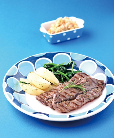 쇠고기등심 240g, 시금치 50g, 마늘 15g, 양파 50g, 건바질 2g 감자 60g, 레몬 25g, 파슬리가루 1g 소스 : 르네디종 홀그레인머스터 15g, 사과 80g, 버터 15g