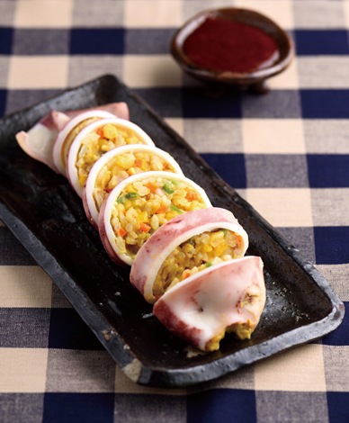 - 6. 오징어 안쪽에 밀가루를 묻혀주고 소를 채워 팬에 구워준다.