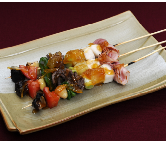 소고기(100g), 소금(0.5g), 후춧가루(0.02g), 인삼(20g) 올리브오일(5g), 파프리카(20g), 파인애플(30g) 표고버섯(20g), 대파(30g), 토마토(20g), 베이컨(30g) 마늘(20g), 꼬치(3개) - 소스 : 유자청(50g), 저염간장(10g), 레몬(10g), 설탕(10g)