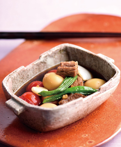 소고기 우둔살 200g, 메추리알 100g, 방울토마토 100g, 마늘 30g, 꽈리고추 50g, 양파 45g 양념장 : 맛간장 30g, 흰후추 1g, 어간장 15g, 설탕 15g
