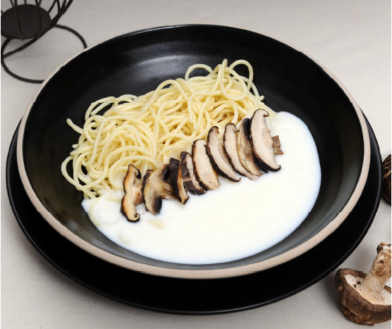 양송이(20g), 표고버섯(80g), 소금(0.5g), 후춧가루(0.02g) 스파게티(100g), 올리브오일(10g) - 크림소스 : 밀가루(10g), 버터(10g), 우유(200g) 생크림(20g)