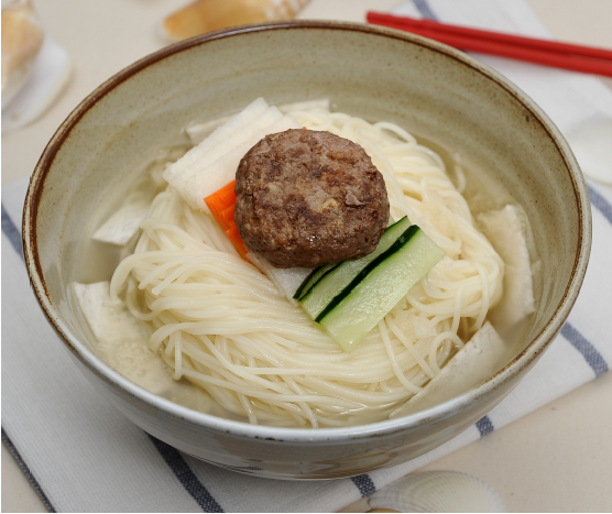 동치미(400g), 배(30g), 식초(10g), 다진 소고기(30g) 오이(20g), 당근(20g), 양파(10g), 후춧가루(0.2g), 정종(2g) 설탕(10g), 저염간장(5g), 다진 마늘(10g), 다진 대파(10g) 매실액(3g), 참기름(2g), 통깨(2g), 국수(100g), 식용유(5g) - 곁들임채소 : 오이(20g), 당근(20g), 양파(10g), 후춧가루(0.2g) 정종(2g), 설탕(10g), 저염간장(5g)