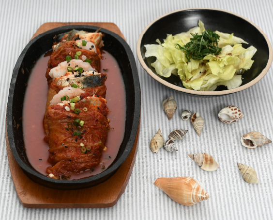 고등어(1마리), 새우(5마리), 새송이버섯(1개), 당근(30g), 미나리(20g), 깻잎(2장), 가지(20g), 오이(30g), 아몬드(20g), 마늘(20g), 파프리카(50g), 어린잎(10g), 양상추(30g), 땅콩(10g), 묵은지(200g)
