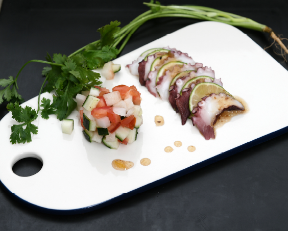 - 6. 유자청, 레몬, 올리브오일, 소금으로 소스를 만들고, 접시에 문어와 라임을 담고 그 옆에 썰어 놓은 야채와 과일을 올려 소스를 올린다.