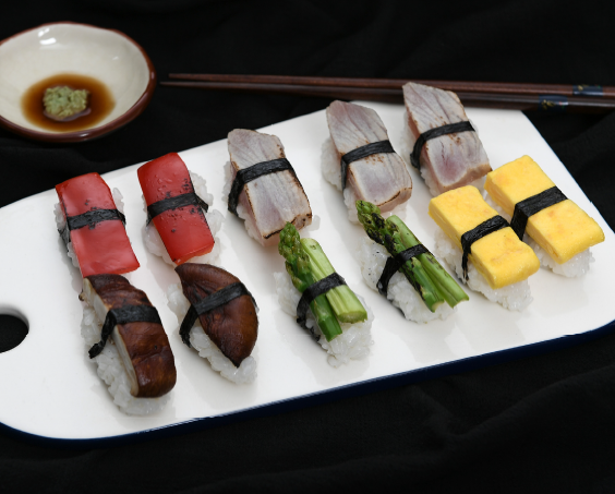 참치(100g), 파프리카(50g), 아스파라거스(3개), 표고버섯(2개), 달걀(2개), 밥(200g), 김(10g), 다시마(100g), 무(30g), 가쓰오부시(20g), 와사비(20g), 식초(20g), 설탕(20g), 소금(0.1g)