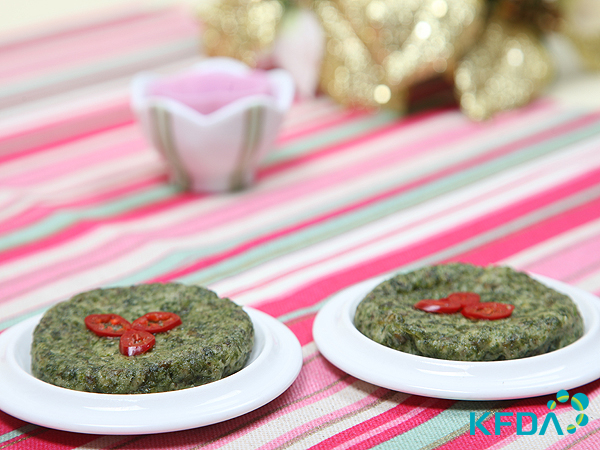 물파래 5g, 노란콩 25g(불린것 52g), 우리밀가루 10g, 현미유 5g, 홍고추 2g, 물 120g 간장 2g, 파 1g, 식초 0.5g, 통깨 0.2g
