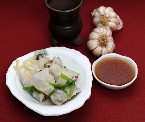 - 6. 김발을 이용하여 양배추를 돌돌 말고, 미나리를 데쳐 끈으로 묶어 접시에 올리고, 간장과 맛술, 참기름을 섞은 간장소스를 만들어 담는다.