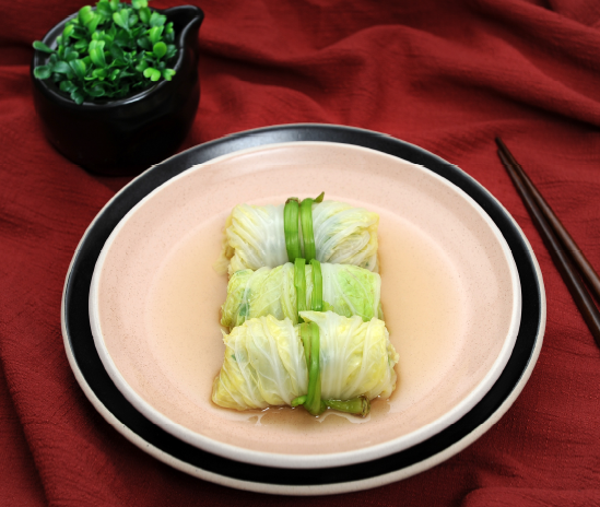 - 6. 말아놓은 배추만두를 쪄 놓은 미나리 끈으로 묶은 후, 만들어 놓은 육수가 끓으면 배추만두를 넣고 간장으로 간을 한 뒤 한 번 더 끓여서 완성한다.