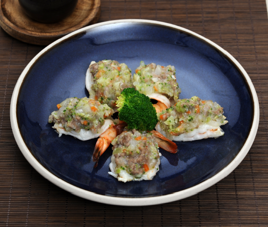 새우(100g), 소금(0.5g), 후춧가루(0.02g) 다진소고기(30g), 마늘(10g), 브로컬리(20g), 당근(20g) 양파(20g), 소금(0.5g), 달걀(30g), 녹말(10g)