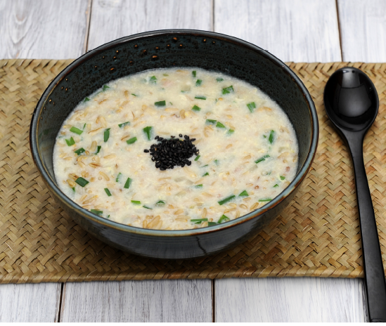 귀리(100g), 쌀(30g), 양파(20g), 부추(20g), 소고기(20g) 참기름(5g), 달걀(50g), 흑임자(2g)