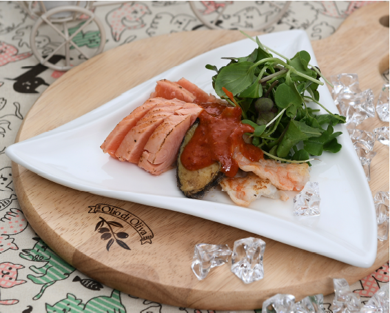 새우(3마리), 전복(2개), 연어(100g), 겨자가루(20g), 어린잎(30g), 요구르트(20g), 고추장(30g), 설탕(10g), 식초(10g), 소금(1g)