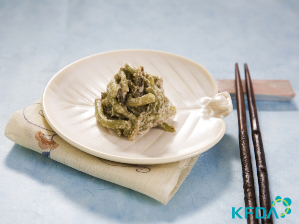 주재료 : 머위대 70g, 들기름 2g, 쪽파 5g, 물 100g - 양념 : 거피들깨가루 6g, 국간장 3g, 다진 파 2.5g, 다진 마늘 1g, 소금 0.5g