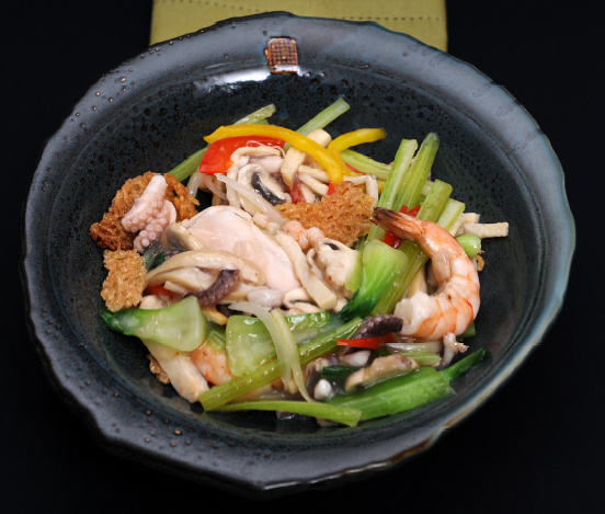 닭가슴살(120g), 생강즙(5g), 정종(10g), 시금치(20g) 당근(20g), 양파(20g), 샐러리(20g), 파프리카(20g) 느타리(20g), 주꾸미(30g), 새우(20g), 청경채(20g) 누룽지(50g), 튀김기름(200g), 육수(200g), 저염간장(10g) 녹말가루(10g), 마늘(10g), 소금(0.2g), 후춧가루(0.1g)
