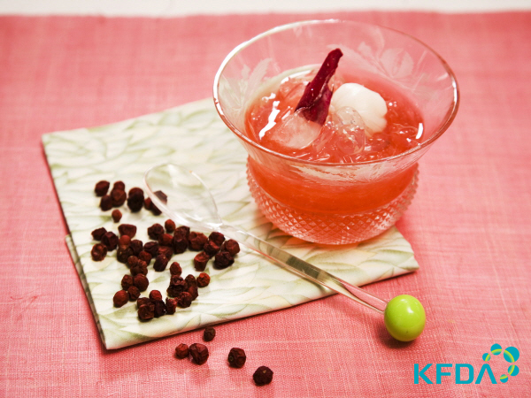- 6. 오미자 슬러쉬에 우무를 올린다.본 저작물은 '식품의약품안전처'에서 작성하여 개방한 '조리식품의 레시피 DB'을 이용하였으며,