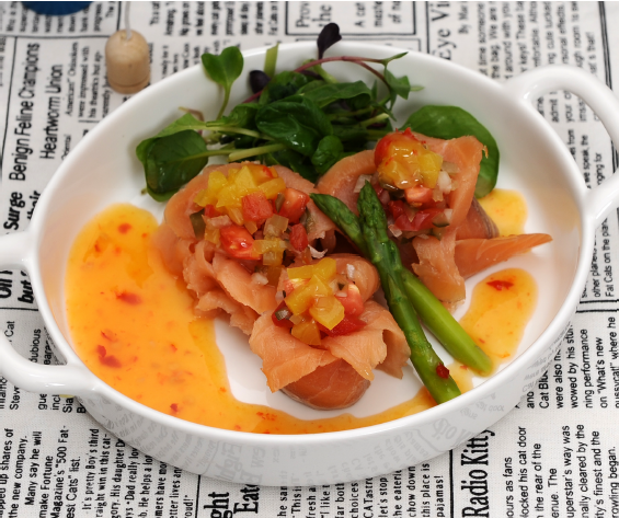 훈제연어(100g), 양파(20g), 피클(20g), 후춧가루(0.02g) - 소스 : 오렌지(30g), 오렌지 주스(20g), 설탕(10g), 레몬(10g) 물녹말(10g), 스위트칠리(20g) - 곁들임채소 : 아스파라거스(20g), 어린잎(10g)