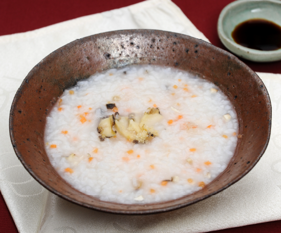 쌀(50g), 전복(50g), 새우살(20g),양송이(20g), 당근(10g) 참기름(10g), 잣(10g) - 소스 : 저염간장(5g)