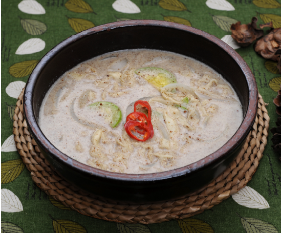 밀가루(100g), 녹말가루(10g), 식용유(10g), 소금(0.2g) 달걀(50g), 애호박(20g), 홍고추(10g), 들깨가루(30g) - 육수 : 건새우(10g), 멸치(20g), 양파(20g), 다시마(10g) 마늘(10g), 무(50g)