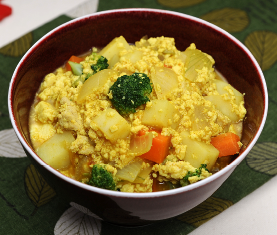 두부(100g), 소금(0.3g), 코코넛밀크(20g), 당근(20g) 양파(20g), 브로컬리(20g), 돼지고기(50g), 감자(20g) 버터(10g), 카레가루(30g), 물(250g)