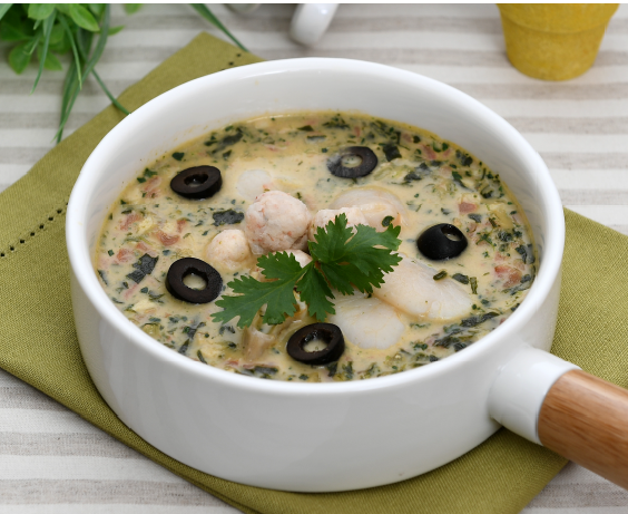 관자(2개), 새우(3마리), 미역(20g), 새송이버섯(1개), 시금치(30g), 토마토(50g), 마늘(10g), 블랙올리브(3알), 메추리알(5개), 레몬(1/4개), 두유(100g), 생크림(50g), 우유(200g)