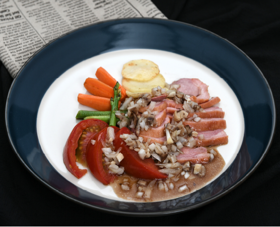 오리고기(가슴살, 120g), 당근(20g), 토마토(100g), 새송이버섯(1개), 표고버섯(1개), 감자(50g), 아스파라거스(2개), 소금(0.2g), 후추(0.01g), 올리브오일(10g), 발사믹소스(100g) 양파(20g)