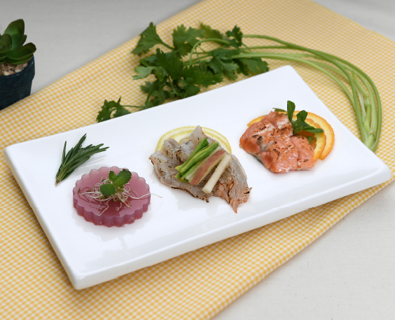 - 6. 석류주스 젤리가 담긴 접시에 새우와 애호박을 담고 소스를 올린 뒤 연어와 사과, 호박을 올려 담는다.