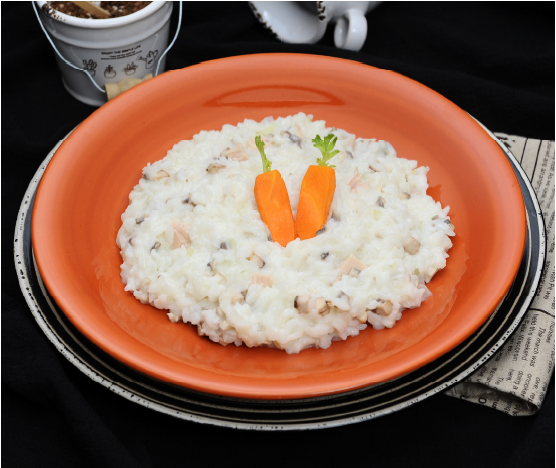 닭고기살(50g), 양송이(60g), 떡볶이떡(20g), 양파(20g) 당근(30g), 소금(0.2g), 버터(10g), 밥(100g), 육수(50g) 우유(50g), 생크림(10g), 치즈(10g)