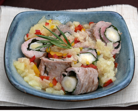 - 6. 고기를 구운 뒤 준비한 야채와 두릅을 넣고 돌돌 말아 간장에 졸인다.
