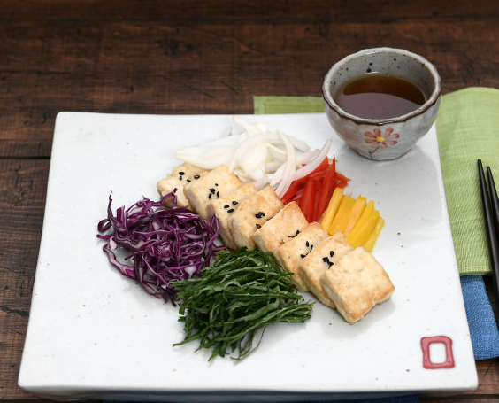 두부(150g), 홍피망(30g), 황파프리카(30g), 적채(30g), 양파(30g), 깻잎(2장), 흑임자(5g), 밀가루(10g), 매실액(20g), 저염간장(20g), 설탕(20g), 소금(0.1g)