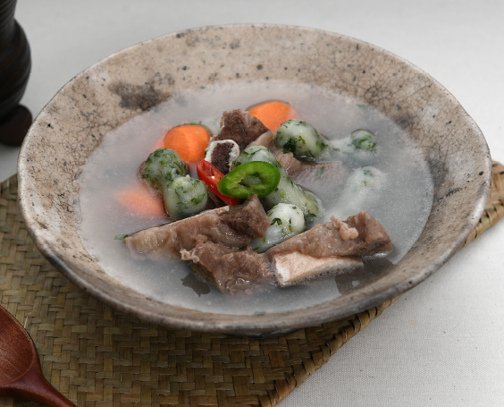 돼지고기(뼈갈비, 200g), 쑥(20g), 찹쌀가루(200g), 당근(20g), 감자(50g), 숙주(20g), 청양고추(1개), 홍고추(1개), 소금(0.2g)