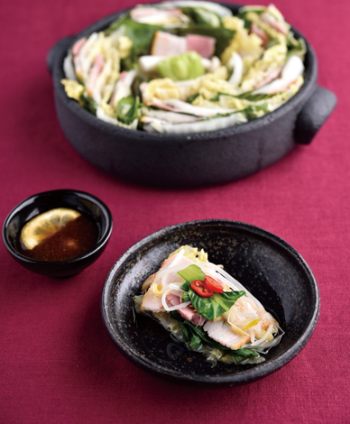 알배추 8장(200g), 깻잎 12장(20g), 베이컨 80g 무 100g, 숙주 120g, 청경재 80g, 백일송이 25g 국물 : 채소국물 8컵(표고버섯, 다시마, 무, 마늘, 대파뿌리, 양파), 맛간장 15g 소스 : 멸치간장 15g, 와사비 10g, 레몬즙 15g 소스 : 칠리소스 30g, 올리고당 15g, 레몬즙 15g
