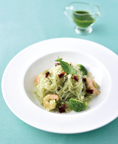 실곤약 150g, 칵테일새우 100g, 브로콜리 100g, 바질 5g, 레몬즙 15g 소스 : 잣 바질페이소스 15g, 마늘오일 15g , 드라이토마토 10g