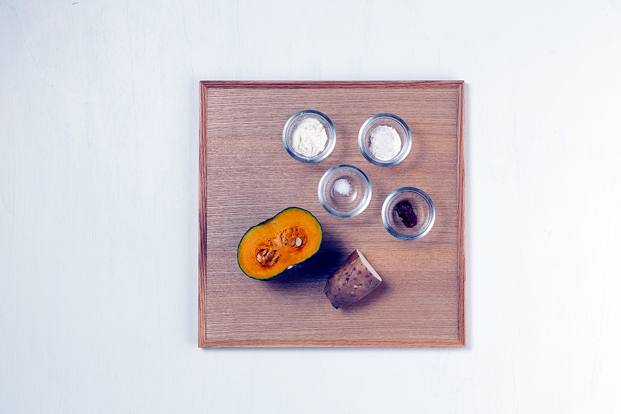 단호박 70g, 마 20g, 밀가루 5g, 찹쌀가루 5g, 건대추 1g, 소금 0.3g