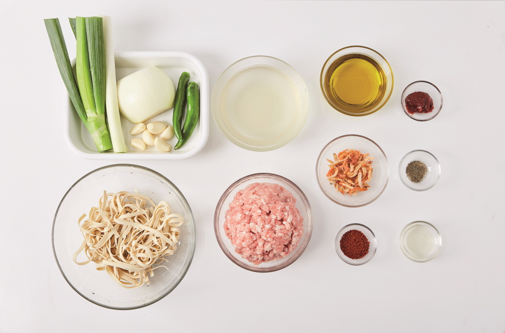 [ 2인분 ] 양파(½개), 마늘(6~7쪽), 대파(1대), 다진 돼지고기(400g), 두부면(2팩=200g), 새우(¾컵), 닭육수(5컵), 청양고추(2개), 고추장(0.5Ts), 후춧가루(0.8Ts), 식초(1.5Ts), 올리브유(10Ts), 고춧가루(1Ts)