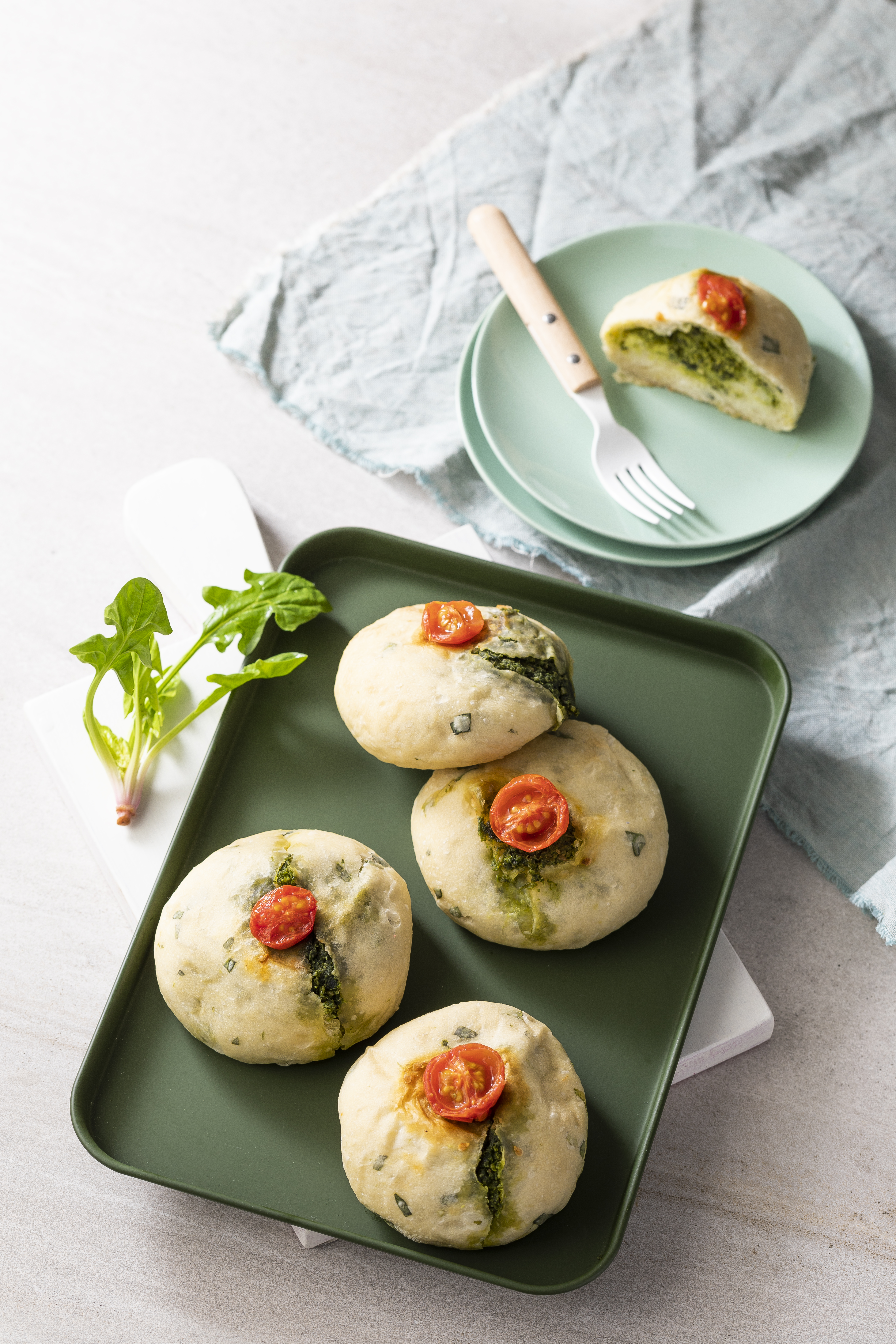 - 4. 중간 발효가 끝난 반죽을 납작하게 펴고 안에 시금치 필링을 넣어 잘 봉합한 뒤 팬에 놓고 살짝 눌러준다.