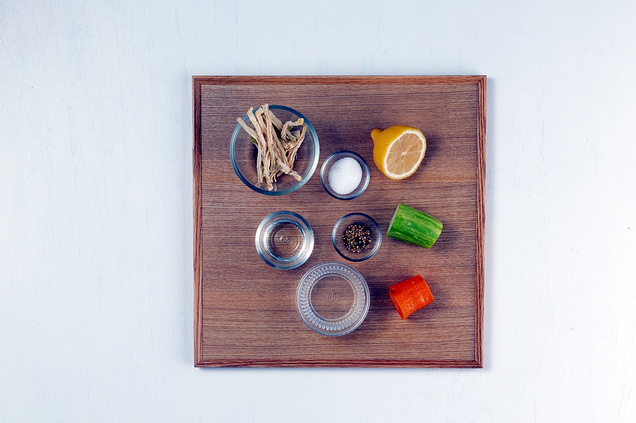 무말랭이 10g, 식초 30g, 설탕 25g, 레몬 8g, 당근 5g, 오이 5g, 피클링스파이스 5g, 물 100g