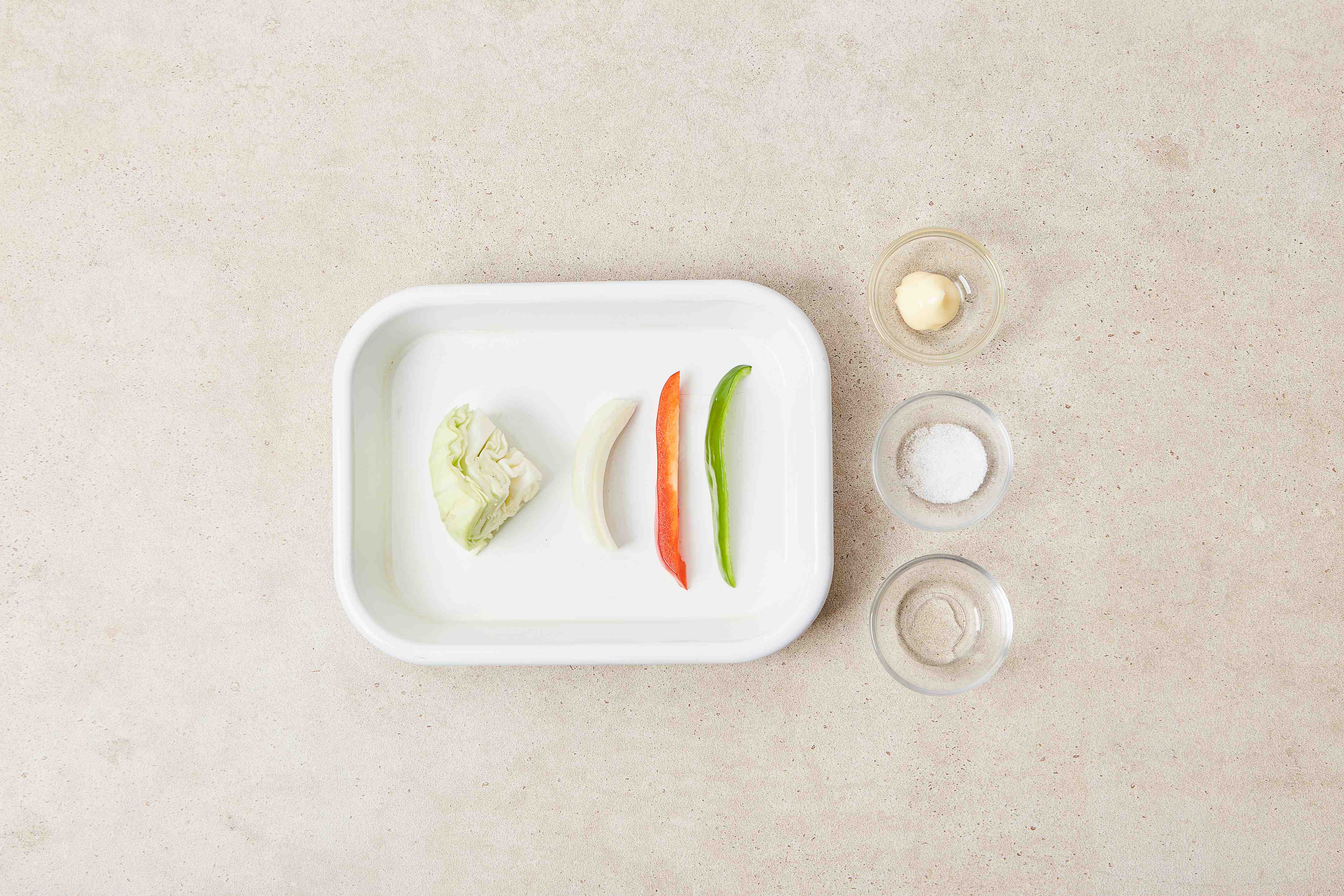•필수 재료 : 양배추(30g), 양파(10g), 적파프리카(3g), 청피망(3g) •마요네즈드레싱 : 마요네즈(5g), 설탕(1g), 식초(0.5g)