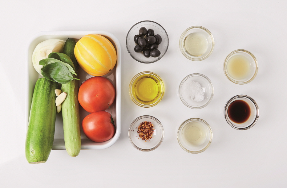 [ 2인분 ] 토마토(2개), 참외(1개), 오이(1개), 양파(½개), 마늘(3쪽), 애호박(1개), 바질잎(4장), 블랙올리브 파우더(약간), 레몬즙(1Ts), 올리브유(5Ts), 소금(0.4Ts), 페페론치노(0.3Ts), 저염 간장(0.5Ts), 식초(2Ts), 꿀(1Ts)