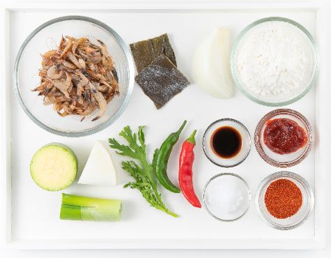 물 300ml, 다시마 2g, 양파 15g, 새뱅이 30g, 밀가루 20g, 호박 10g, 무 10g, 청양고추 5g, 파10g, 마늘 5g, 쑥갓 5g, 고춧가루 3g, 고추장 3g, 소금 2g, 간장 1g