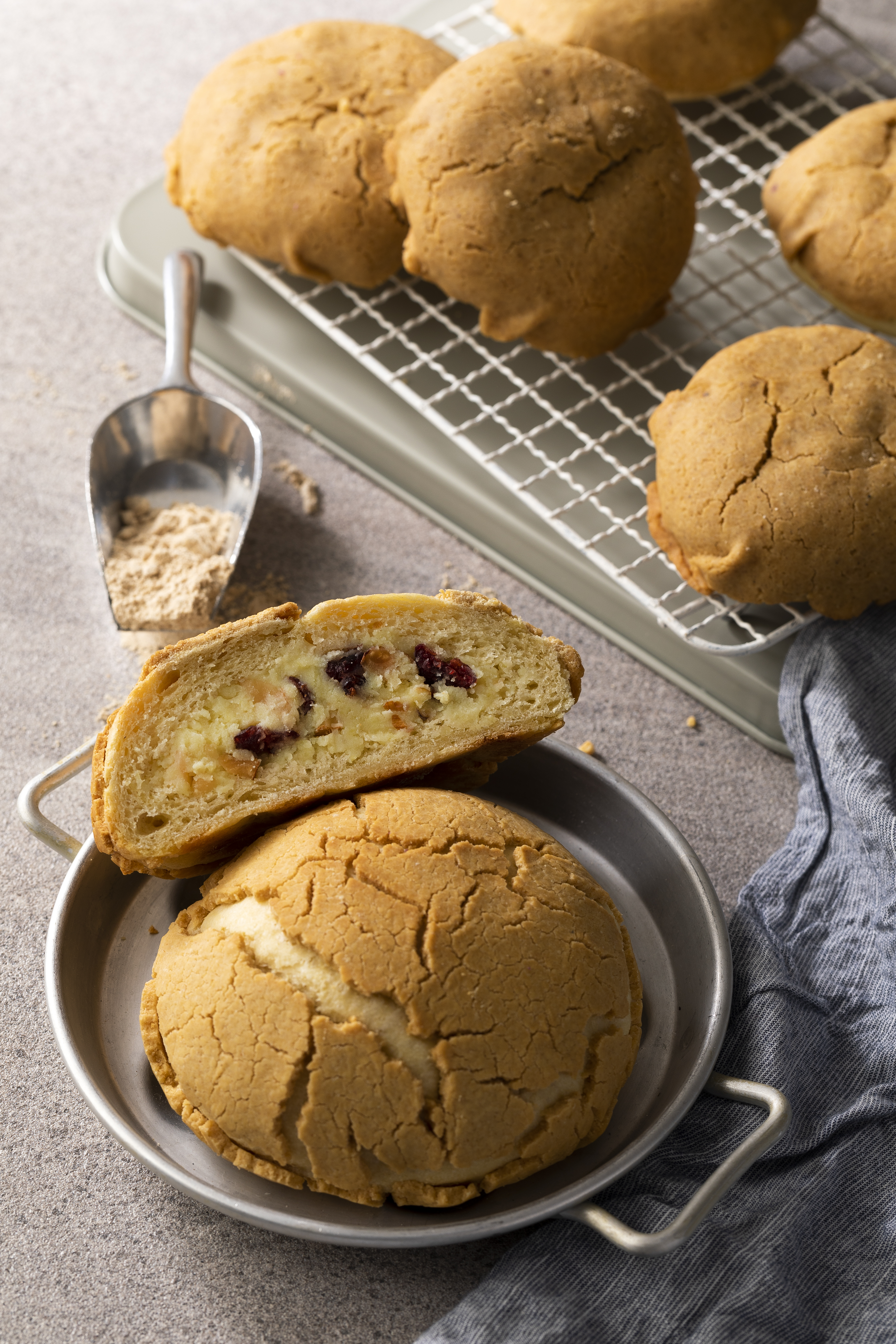 (반죽재료) 강력분 320g, 날콩가루 80g, 따뜻한 우유 140ml, 이스트 8g, 달걀 2개, 코코넛 오일 20g, 소금 2g (비스킷재료) 박력 쌀가루 100g, 볶은 콩가루 60g, 베이킹파우더 2g, 달걀 2개, 버터 60g (속재료) 고구마 500g, 우유 50g, 크랜베리 100g, 아몬드 30g