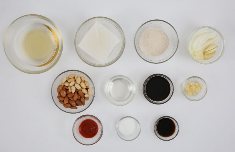 냉동 곤약(200g), 채 썬 양파(50g), 납작 썬 마늘(10g), 채소 육수(100㎖), 아몬드(100g), 땅콩(100g), 통밀가루(45g), 미림(20g), 간장(5g), 간 마늘(10g), 토마토 페이스트(30g), 간장(10g), 설탕(3g), 발사믹식초(5g), 식용유(5㎖)