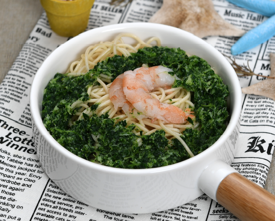 새우(대하, 3마리), 스파게티(100g), 시금치(30g), 브로콜리(50g), 바질(10g), 생크림(50g), 올리브오일(10g), 소금 (0.2g)