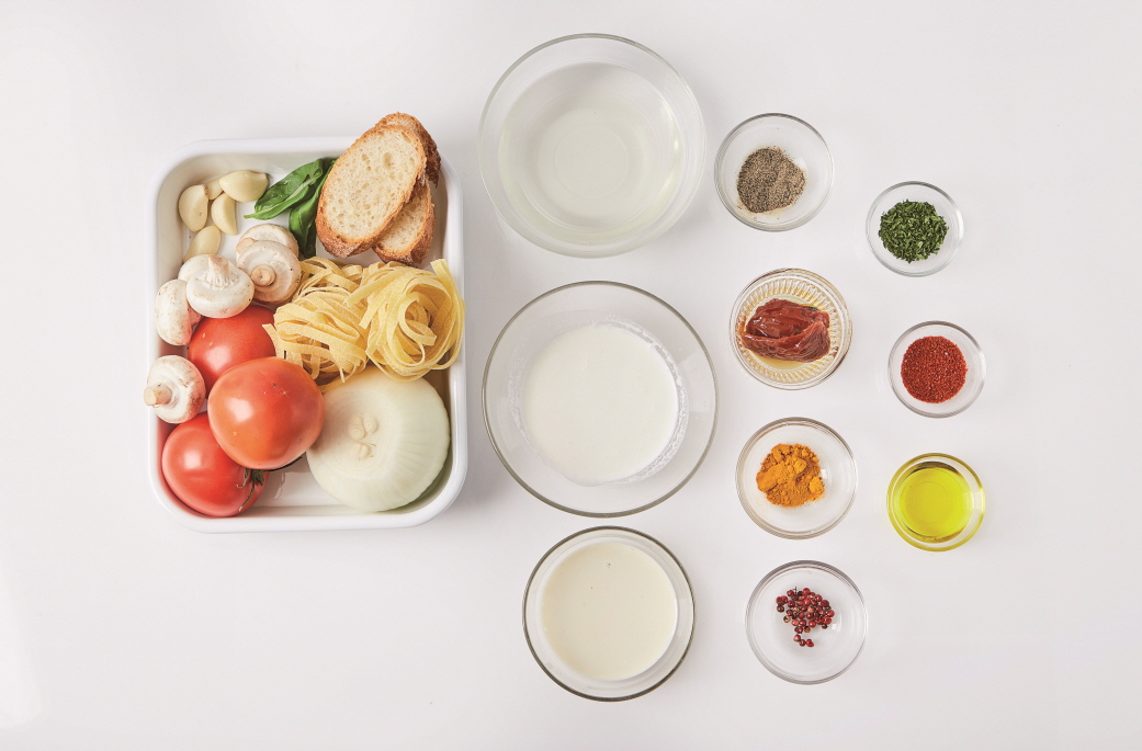 [ 2인분 ] 양파(1개), 양송이버섯(6개), 마늘(5쪽), 토마토(3개), 탈리아텔레(200g), 말린 토마토(2개), 다진 파슬리(0.5Ts), 핑크 페퍼(5알), 바질잎(2장), 바게트(약간), 물(1260ml), 무(150g), 양파(1개), 다시마(5×5cm, 2장), 올리브유(2Ts), 강황가루(2ts), 고운 고춧가루(0.5ts), 식물성 생크림(⅔컵), 두유(¼컵), 후춧가루(2ts)