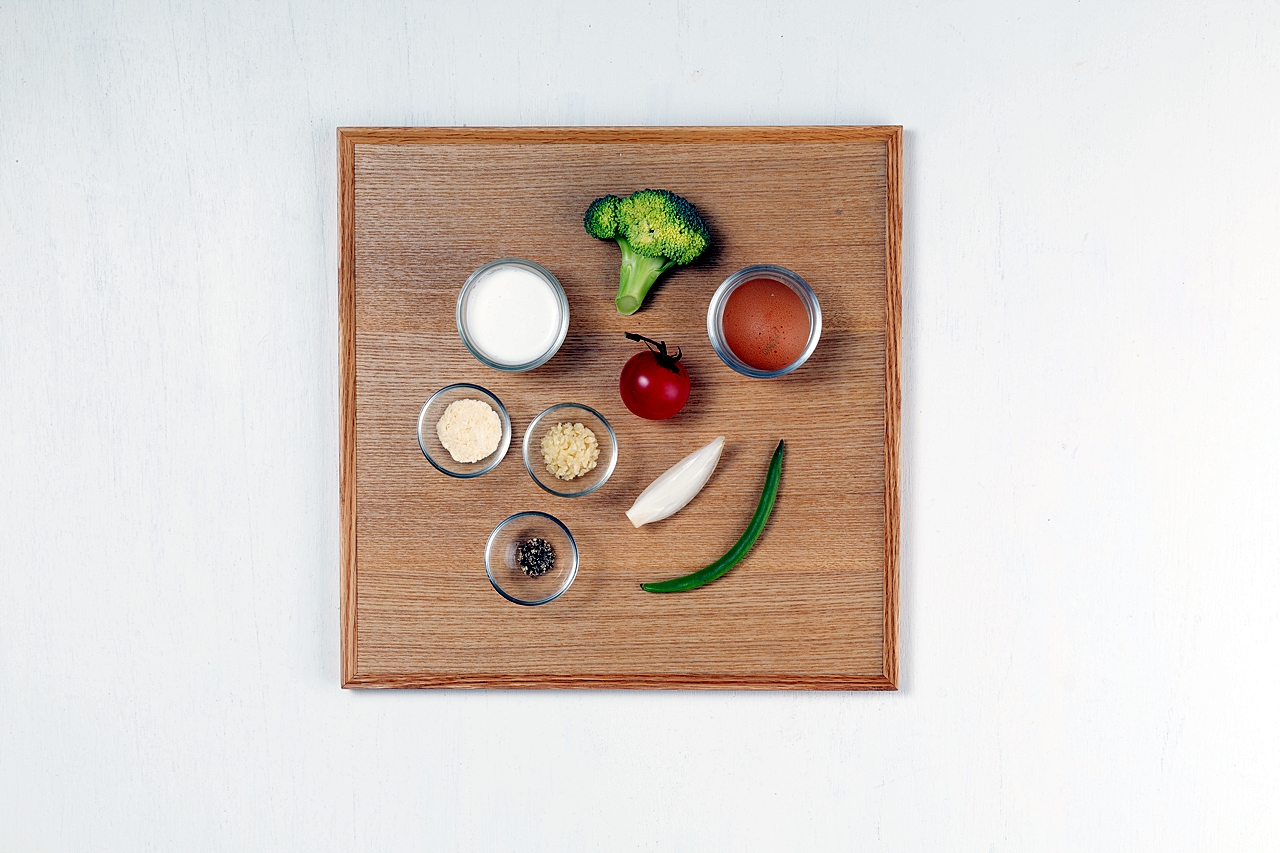 방울토마토 20g, 양파 5g, 브로콜리 10g, 그린빈스 10g, 계란 80g, 파마산치즈 3g, 생크림 20g, 마늘 0.1g, 후추 0.1g
