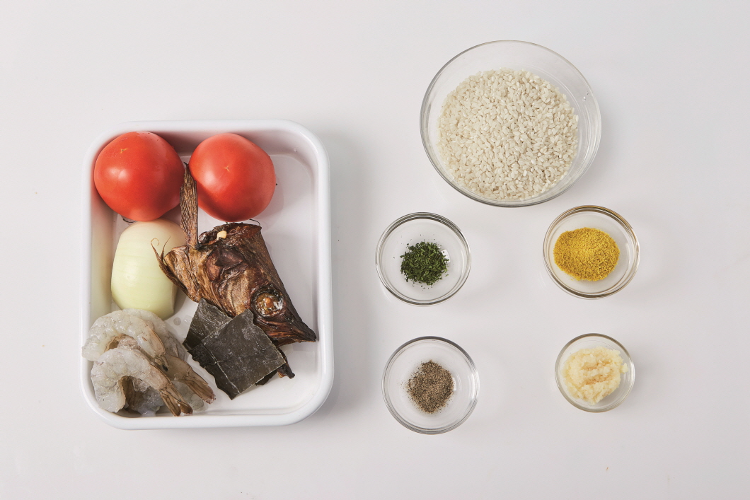 [ 2인분 ] 양파(½개), 토마토(2개), 새우(8마리), 쌀(1½컵), 카레가루(1Ts), 황태 머리(1개), 다시마(5×5cm, 1장), 다진 마늘(1Ts), 파슬리가루(0.3Ts), 후춧가루(0.3Ts)