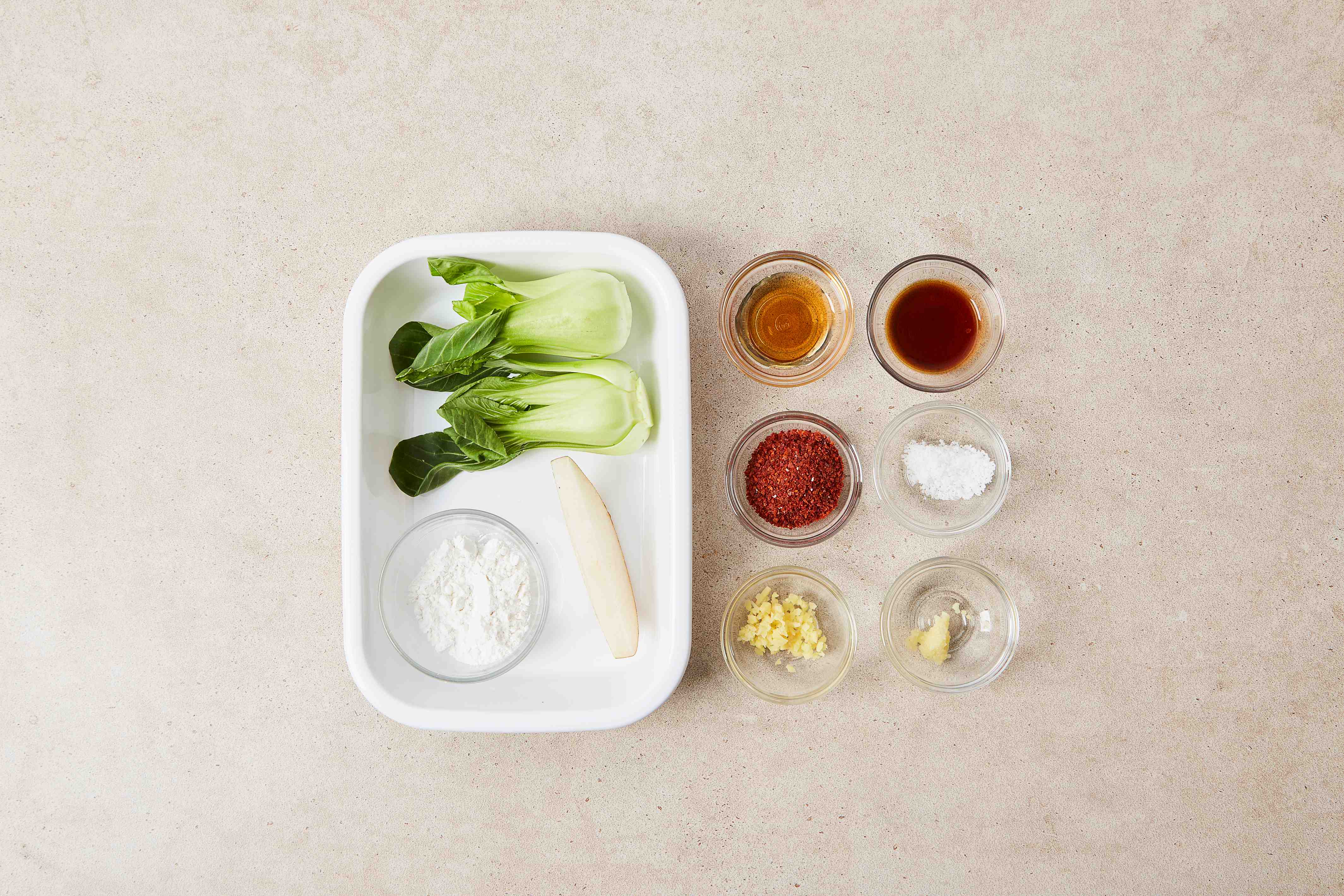 •필수 재료 : 청경채(60g), 배(10g) •양념장 : 매실액(5g), 고춧가루(5g), 저염간장(3g), 다진마늘(1g), 다진생강(2g) •양념 : 소금(2g), 찹쌀가루(10g)