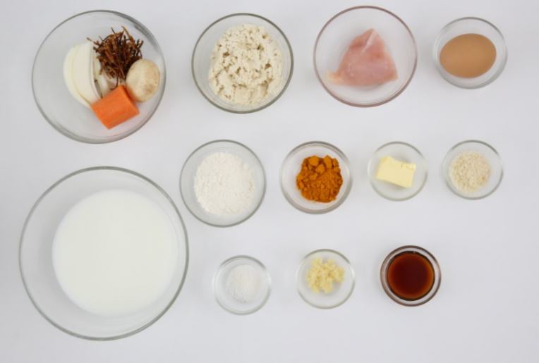 양파(30g), 당근(20g), 양송이버섯(20g), 불린 함초(15g), 으깬 두부(120g), 닭가슴살(60g), 달걀(40g), 빵가루(5g), 밀가루(10g), 버터(10g), 우유(250g), 강황가루(10g), 함초소금(0.5g), 다진 마늘(5g), 저염 간장(3g), 식용유(10ml)