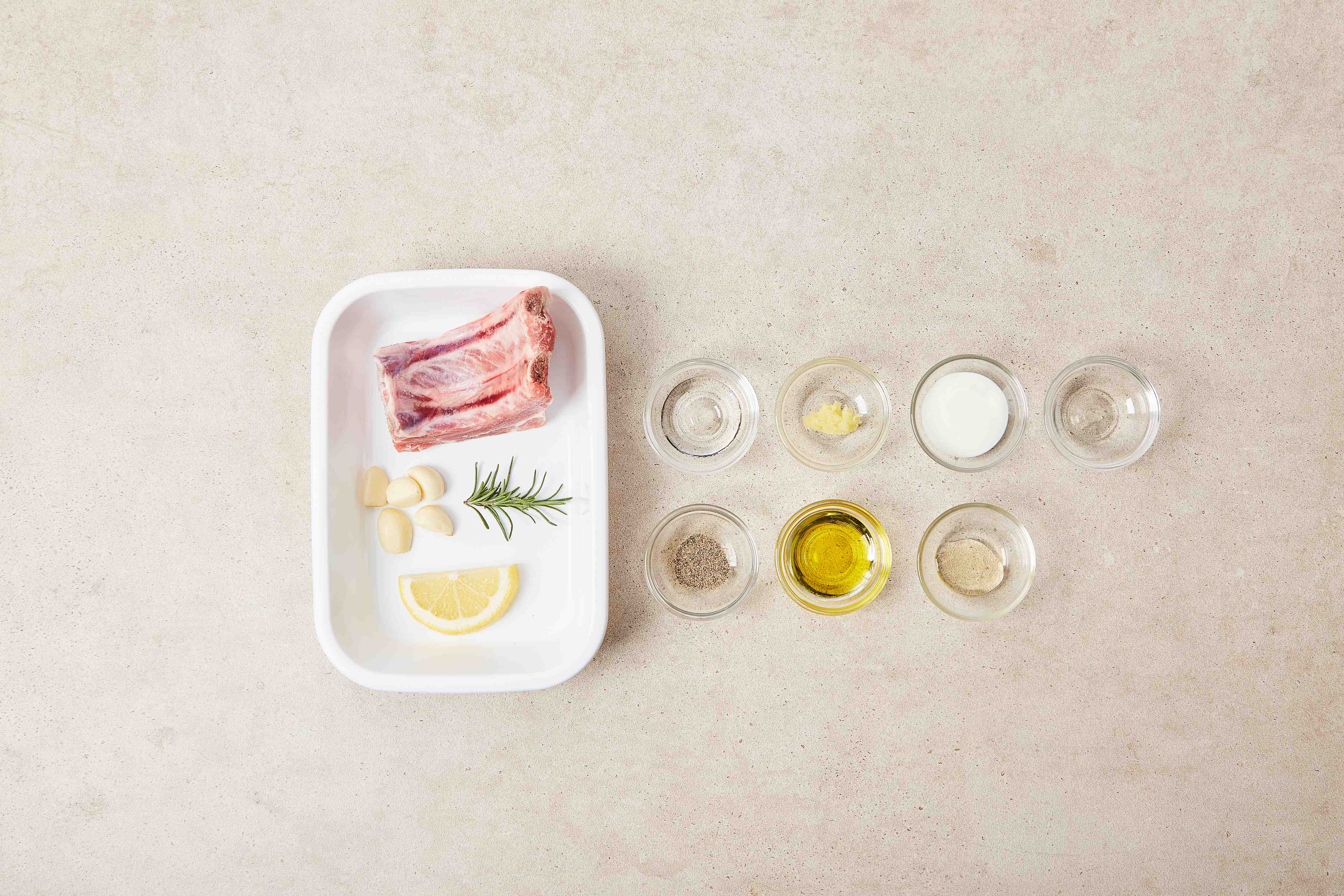 •필수 재료 : 등갈비(150g), 마늘(10g), 레몬(15g) •밑간 : 소주(10g), 로즈메리(1g), 다진마늘(1g), 후춧가루(1g), 올리브유(5g) •디핑소스 : 요거트(10g), 꿀(2g), 레몬즙(2g)